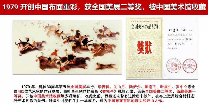 1979年,叶星生的巨作《赛牦牛》横空出世,一举获得全国美展二等奖,并被中国美术馆永久收藏!这幅作品标志着布面重彩画的诞生——将传统唐卡的宗教庄严与现代绘画的自由表现结合,把汉藏文化的视觉体系推向全新高度!从这一年开始,叶星生开创了一个画种、奠定了一座山峰!