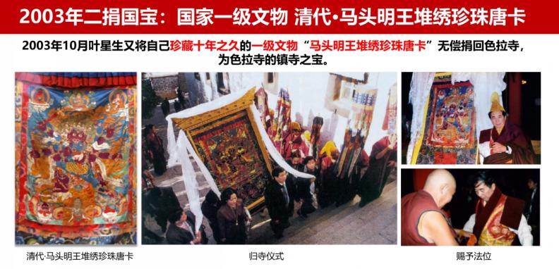 更有甚者,2003年,叶星生将珍藏的国家一级文物《马头明王堆绣珍珠唐卡》无偿捐赠给色拉寺,成为西藏历史上第一位获赠“法位金印”的汉族人!他,不仅是艺术家,更是文化信仰的守护者,是汉藏情感的桥梁,是精神世界的开拓者!