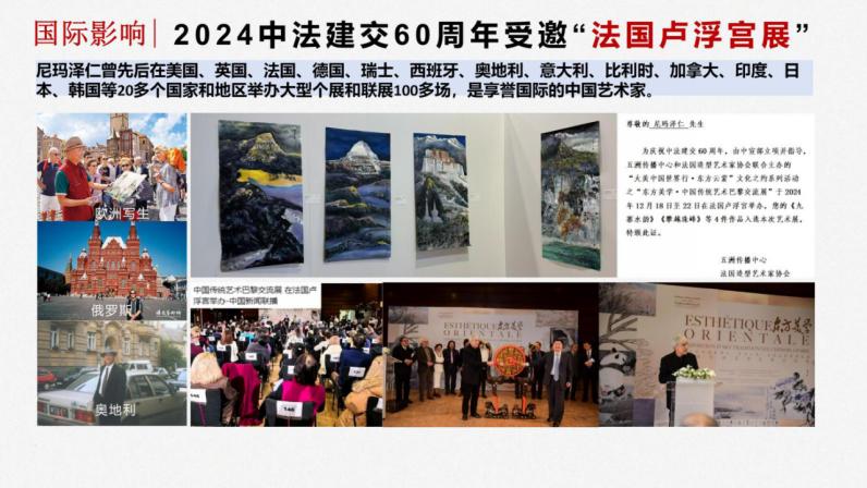 当一幅画不再局限于画廊,而被用作国家形象展示,那它的价值,早已超越金钱。尼玛泽仁的作品,进入了中国驻外大使馆、国际艺术机构、世界重要艺术展馆,成为国家对外文化交流的“艺术名片”。他是受邀最多的中国艺术家之一,他曾在20多个国家举办个展,从华盛顿到巴黎,从东京到伦敦,他的山水画,像长江与黄河一样,奔流不息,跨越国界。