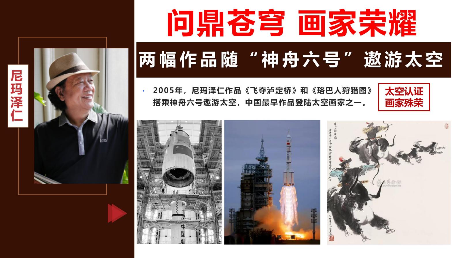 更令人震撼的是,他的作品曾随中国航天飞船进入太空。那是人类文明的一次跨越——来自雪域高原的笔触,在无垠宇宙中漂浮。那一刻,尼玛泽仁不再只是画家,而是让中国文化抵达星辰的使者。