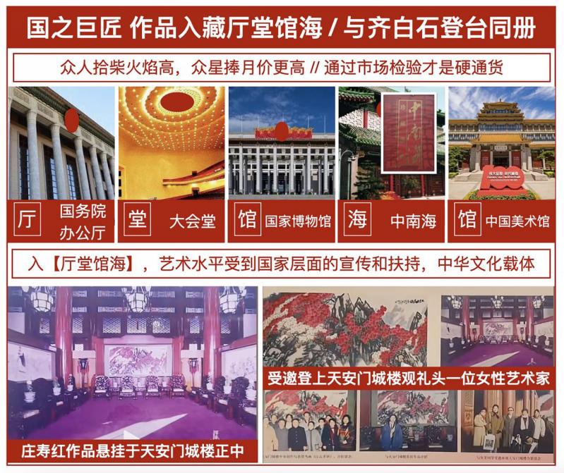 庄寿红的艺术成就,不仅体现在画坛声誉,更体现在国家收藏体系的高度认可。她的作品被国务院办公厅、大会堂、国家博物馆、中南海、中国美术馆等国家级艺术机构收藏,其代表作悬挂于天安门城楼正中厅——她更是唯一受邀登上天安门城楼观礼的女性艺术家。这不仅是对她艺术造诣的肯定,更象征着国家对女性艺术力量的尊重。