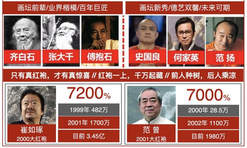 庄寿红与齐白石并列入《国之巨匠大红袍画册》,成为首批被列入“近现代大红袍画家”的艺术家之一,全国不到十人。她的作品在艺术市场上屡创佳绩:《红梅映雪图》:9350万元;《丹霞春意图》:8250万元;《春风拂柳图》:8008万元;《锦绣山河图》:7568万元;如此惊人的市场表现,不仅体现了她作品的收藏价值,更巩固了她在艺术史上的传奇地位。艺术界誉她为“当代女性艺术第一红”,真正实现了“男看崔如琢,女看庄寿红”的至高评价。