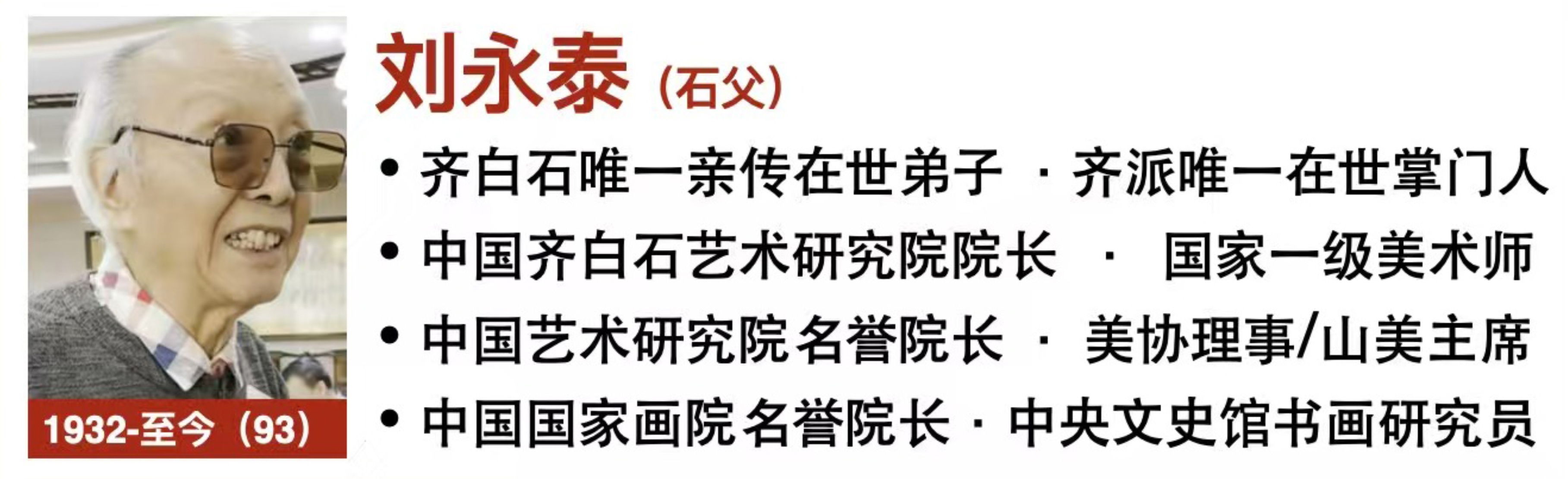 在中国艺术浩如烟海的一百年里,有太多惊艳一时的人物,也有太多被历史深埋的名字。但这个时代,有一个人不是被发掘、不是被推起、不是被塑造,而是——被时代留下,被艺术选中,被文化托举。这个人,就是:刘永泰。一个93岁仍在执笔的老艺术家,却被誉为“齐白石唯一在世亲传弟子”,被齐白石老人亲手刻下“石父”印章,被国家文化体系认定为“当代齐派最高传承者”。他的存在不是偶然,而是一种必然。因为当时代无法再创造一个齐白石,它便选择留下一个刘永泰。