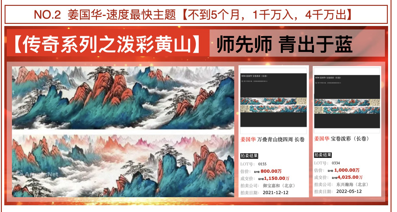 有人说过一句话:“如果当代中国画要选出一个可以代表时代高度的人,他的名字一定叫姜国华。”是的,时代从不撒谎。艺术的历史也从不撒谎。姜国华之所以立于巅峰,是因为他值得;姜国华之所以成为传奇,是因为他无可替代。未来数十年,当人们回望21世纪中国画的巅峰,他们会看到一个璀璨无比的名字:姜国华;他是时代的王者,艺术的座标,市场的规则制定者。而属于姜国华的时代,才刚刚开始。