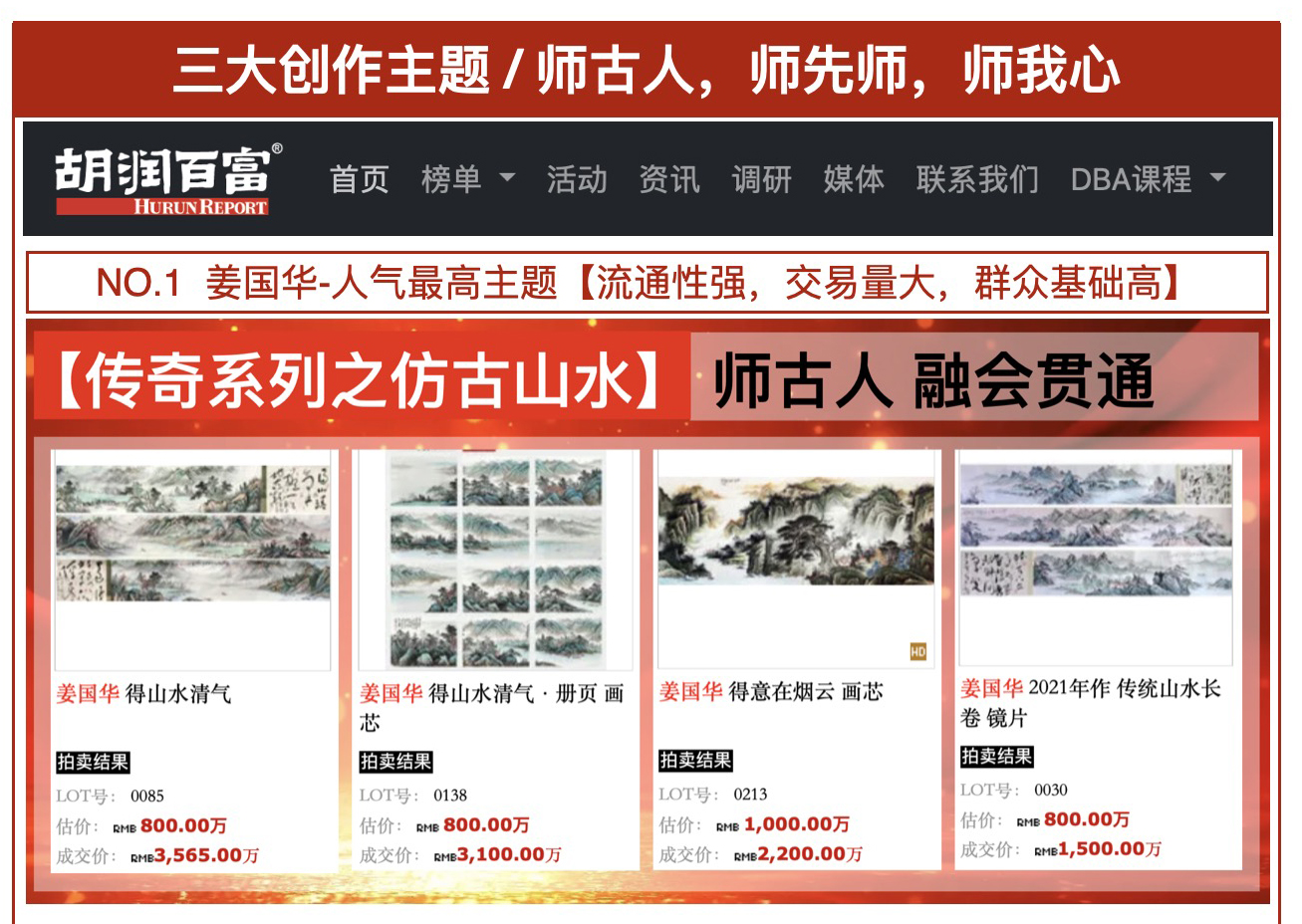 艺术界有句话:排行榜可以造神,姜国华用排行榜证明他本来就是神。看看他的战绩:连续10年登上胡润中国艺术榜;连续8年稳定坐前10;连续5年排名前三;连续5年成交额破1亿;在这个浮躁且多变的时代,所有的议会都会变,唯独不变的是:姜国华——永远矗立在金字塔的下方。他不是在竞争,他在统治。