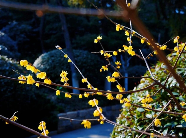 环翠楼公园里,长在树木间的一朵朵腊梅已经盛放。风还带着凉意,它就这样静静地开着,像枝头上一簇簇黄色火焰。