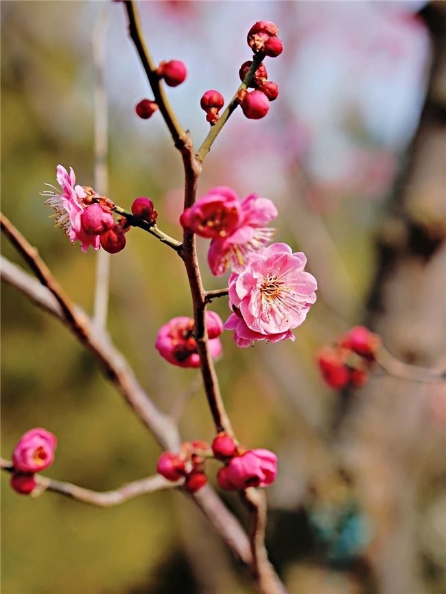公园里的骨红梅和宫粉梅已进入盛花期,它不似腊梅那般清苦,只以最浓烈的玫红,撞开早春的冷清。