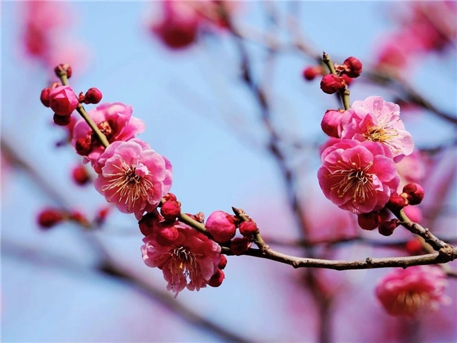 和所有梅花一样,它们不与桃李争艳,只在春寒料峭的时节兀自绽放,满树嫣红映着淡蓝的天,成了早春绝美的风景。