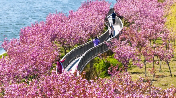 来到鲸园文体公园,你眼前的春色又从鹅黄变成了玫红。