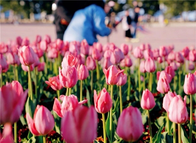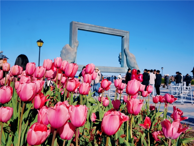 大相框周边:这里的郁金香主要以粉色为主,种植在大相框前的花坛里,数量虽不如海魂广场多,但胜在地标加持——站在大相框前拍照,以粉色郁金香为前景,天然“画框+花海”,特别适合拍人像、打卡纪念。