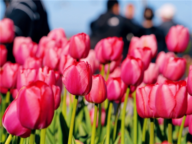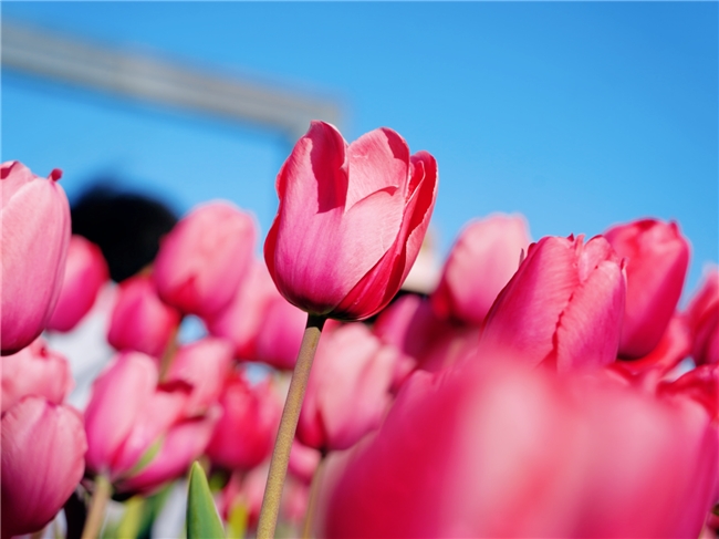 1、低角度拍摄:蹲在花田边缘,镜头向上,以大海和天空为背景,拍郁金香全景,避开人群;