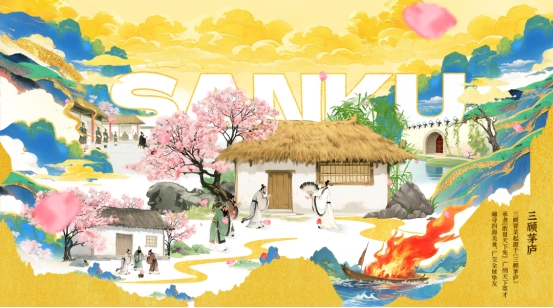 这套设计跳出了传统国潮的繁杂,走“东方美学+西方技法”的融合路线。如背景墙将中华剪纸、印章元素与西方浮雕、徽章手法结合,呈现出的新中式大牌感,既保留了三国文化的底色,也符合国际审美。
